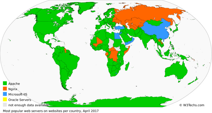 Nginx在俄罗斯拥有76.8%的市场份额,毕竟其开发者Igor Sysoev就是俄罗斯人——2004年10月,Igor发布了最初版本的Nginx。在原属于前苏联的一些国家里,包括白俄罗斯、乌克兰还有哈萨克斯坦,Nginx也有超过70%的市场份额。在亚洲、非洲、南美一些国家,Nginx的表现也很出色。但是在美洲和欧洲的大多地区,Apache仍旧占据领导地位。在中国、土耳其、埃及和一些阿拉伯国家,占据领先地位的是微软的IIS。